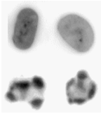 最后两个示例(图 9.11 和 12)显示来自乳腺癌细针穿刺 (FNA) 的数据。将细胞分选到显微镜载玻片上并捕获荧光图像。来自标记细胞的细胞核图像不像来自细胞培养物的那样清晰,但形态与预期的凋亡细胞并不不一致。在 图 9.12中,一些分选的细胞具有正常的细胞核,细胞质中有明亮染色的凋亡小体。这些似乎是吞噬了相邻凋亡细胞的肿瘤细胞(Dowsett 等,1998)。