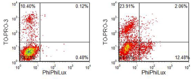 当罗丹明 110(一种在 488 nm 激发的绿色荧光染料)与肽连接时,其荧光被淬灭。当肽被适当的半胱天冬酶切割时,荧光罗丹明110被释放。这种测定的问题是罗丹明肽化合物扩散到活细胞中的速度很慢。另一种以类似原理工作的测定法使用商品名为 PhiPhiLux (OncoImmunin Inc.) (Komoriya et al. , 2000) 的试剂。使用肽接头使基于罗丹明的荧光化合物二聚化。两个分子的紧密接近会淬灭它们的荧光。在细胞中,如果肽被切割,就会释放出两个荧光单体。示例 如图 9.3所示. 使用的探针与 caspase-3 特异性肽序列 DEVDGI 相连。加入了 TO-PRO-3,一种与 DNA 结合但被活细胞排除的二花青素染料。在正常细胞的制备中存在一些死细胞(通过 TO-PRO-3 阳性染色显示)。在用细胞毒性药物星形孢菌素处理后,有一群具有完整细胞膜的凋亡细胞,并且吸收 DNA 染料的细胞百分比大幅增加。这些细胞对 PhiPhiLux 呈阴性,它已从膜受损的细胞中扩散出来。