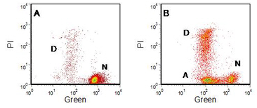 图 9.4。用 DiOC 6 (3) 标记的人淋巴母细胞系 W1L2 。PI 补充说。 一个。控制。 乙。与 KCN 一起孵育 16 小时。标签表示正常 (N)、凋亡 (A) 和“坏死” (D) 细胞。 数据文件