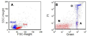 质膜完整性的丧失可以通过使用染料来证明,例如碘化丙啶 (PI),它们被完整的膜所排除,或者使用仅在膜完整时才保留在细胞中的荧光染料。在后一类中,通常使用荧光素二乙酸酯 (FDA) 或羧基荧光素二乙酸酯。FDA 不带电并扩散到细胞中。在细胞中,它被转化为荧光素,带电的荧光素保留在活细胞中。图 9.1显示了一个示例 。活细胞是荧光素+ve、PI -ve 和死细胞荧光素-ve、PI +ve。