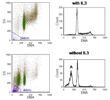 图 9.8。 鼠造血细胞系 BAF3 在有或没有生长因子 IL-3 的情况下生长 16 小时。将细胞固定在 70% 乙醇中并用 PI 重新悬浮在 PBS 中。DNA 直方图已被选通以仅包括单个细胞(未显示 DNA 峰与面积的图)并排除碎片。'A' 标志着亚 G1 峰(凋亡细胞)。 数据文件