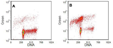 图 9.10。 HL60(人早幼粒细胞系)细胞。 A、对照细胞; B,与喜树碱一起孵育 4 小时。TUNEL 检测。Phoenix Flow Systems 提供的电池。 数据文件
