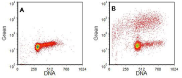 如果用这种方法计算凋亡细胞的百分比,应该有一个明显的亚G1峰,如图所示。像通常所做的那样,在 G1 以下设置一个区域并断言其中的粒子数是凋亡细胞的计数是不正确的。虽然降解的材料是这个区域可能来自凋亡细胞,但一个凋亡细胞可能已经产生了几个片段。