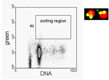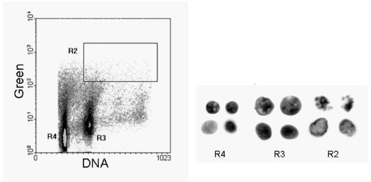 图 9.11。 用 TUNEL 检测标记的乳腺癌细针吸出物。细胞被分选到显微镜载玻片上,并通过荧光显微镜捕获图像。R4 区域是二倍体核;R3,非整倍体和 R2,标记的非整倍体细胞核。